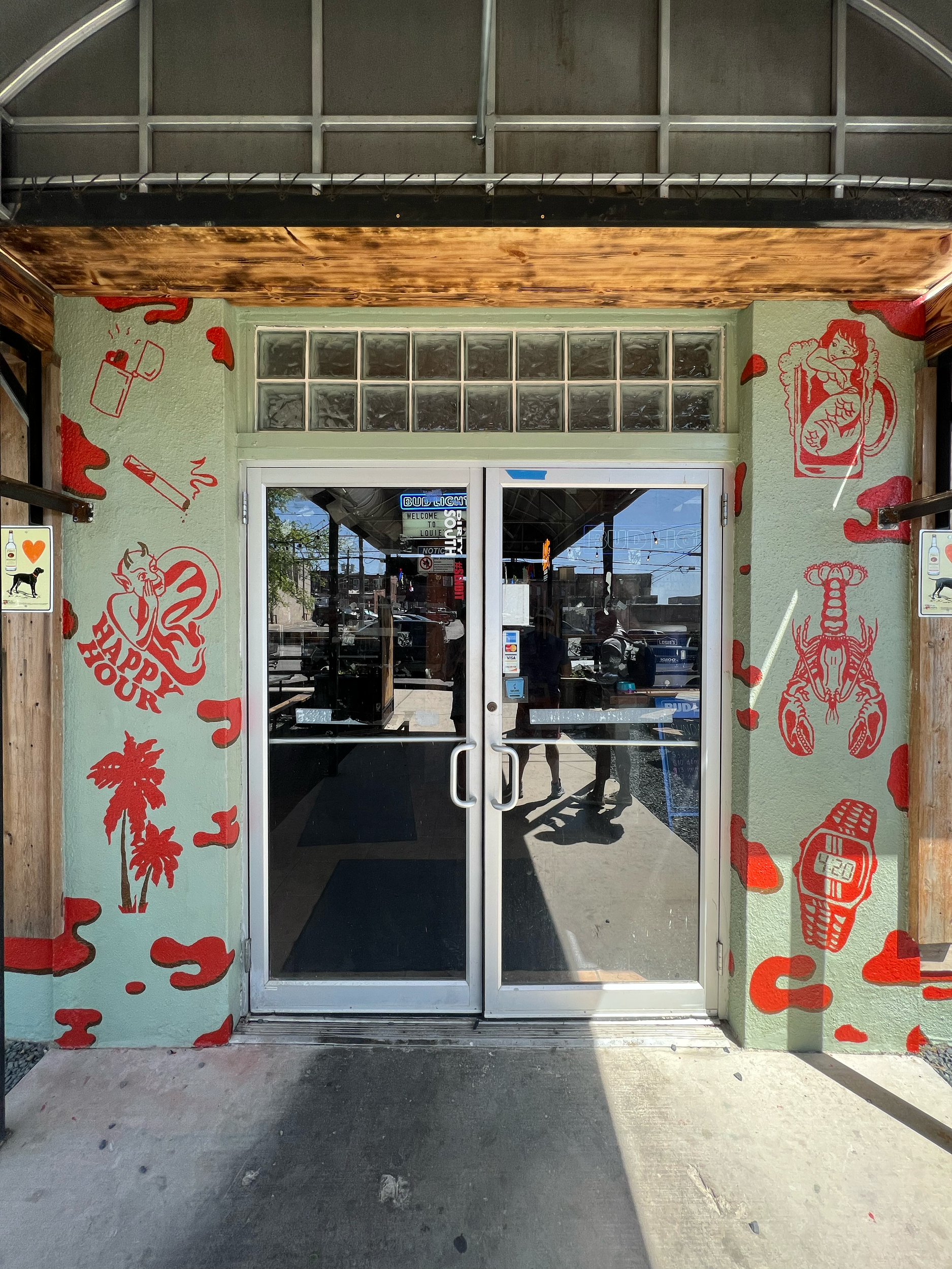 Hand-painted two tone mural for Bulldaddies- designed for playful "stamp-like" imagery showcasing various vibes reflecting lively bar culture and bar's kitchen menu.